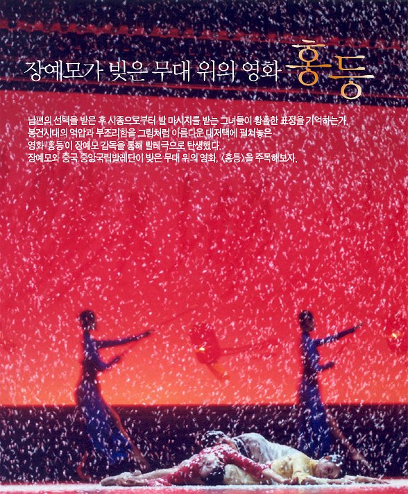 장예모는 이런 작품을 발레극으로 다시 탄생시켰다. 그가 중앙국립발레단에게 작품 제의를 받았을 때 바로 <홍등>이 떠올랐다고 한다. 이유는 세 가지. 이야기의 구성과 형식이 무대극으로 잘 어울리고 기존 발레관객들에게 충분히 어필하면서도 영화를 사랑하는 관객들에게도 사랑받을 수 있다는 것. 마지막으로 이야기 속에 경극이 등장한다는 이유였다. 중국의 전통예술인 경극과 발레의 만남이란 점이 이 거장의 마음을 움직인 것이다.
