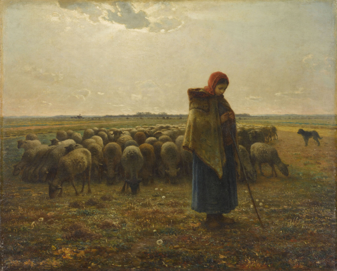 [이데일리 김용운 기자] 멀리 지평선 너머 구름 속에는 하루를 마무리하는 석양이 숨어 있다. 양떼를 몰고 종일 들판을 쏘다녔던 양치기 소녀는 걸음을 멈추고 기도를 하듯 고요하게 서 있다. 양떼는 소녀의 뒤에서 고개를 숙인 채 잠시 휴식을 취한다. 장 프랑수아 밀레(1814~1875)는 농부의 아들로 태어나 농부의 삶을 주제로 작품을 남긴 프랑스의 대표적인 사실주의 화가다. ‘만종’ ‘이삭 줍는 여인’ 등이 세계 미술교과서에 실릴 정도로 유명하다. ‘양치는 소녀와 양떼’(1857)는 욕심내지 않고 하루하루 땀 흘리는 농민에 대한 애정을 진하게 묻힌 작품. 프랑스 파리 오르세미술관의 소장품 중 하나다.