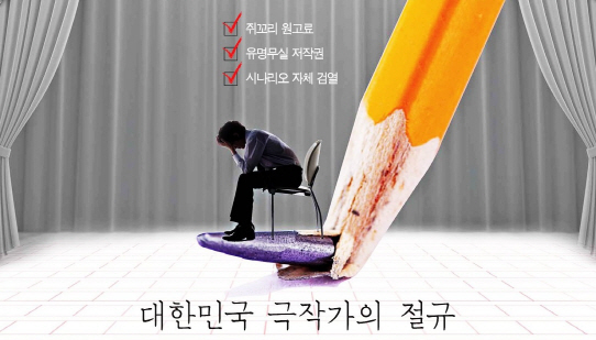 저작권 문제는 연극계가 풀지 못한 해묵은 과제다. 오세혁 극작가는 “작가료를 받지 못했다고 고민하는 후배 극작가가 주변에 정말 많다. 작가란 자존심 때문에 얘기도 못 꺼내는 편이다”라며 “정당하고 떳떳하게 작가료를 요구할 수 있는 제도적 장치가 필요하다”고 강조했다.
