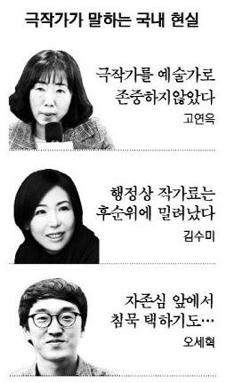 한국극작가협회에 따르면 10년 전과 비교하더라도 연극계 극작가 환경은 별반 바뀐 게 없다. 김수미 한국극작가협회 이사장은 “공연 한 편이 올라가면 지원금 제도나 행정상에서 작가료는 매번 후순위로 밀려 난다”고 말했다. 이어 “아르바이트로 밥벌이를 하지 않고는 못 버틴다”며 “신춘문예 등에서 희곡상이 사라지는 요즘 신작공연도 잘하면 1년에 한 편, 그마저도 힘들 수 있어 펜을 꺾는 극작가가 적지 않다”고 했다.