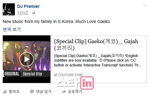 [이데일리 스타in 김은구 기자] 힙합계의 거장 DJ 프리미어(DJ Premier)가 다이나믹듀오(Dynamic Duo) 개코와 특급 의리를 과시했다.DJ 프리미어는 지난 10일 자신의 공식 페이스북 계정에 최근 발매된 개코의 새 솔로 싱글 ‘코끼리(Feat. 랩몬스터)’ 스페셜 클립 영상을 공유했다. 특히 영상과 함께 ‘한국에 있는 나의 가족의 새 음악이다. 개코에게 많은 사랑 보내 달라’라는 메시지를 남기는 등 든든한 지원 사격을 펼쳤다.