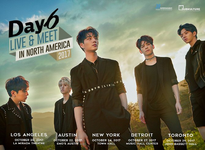 [이데일리 스타in 이정현 기자] 밴드 데이식스(DAY6)가 북미 투어를 통해 글로벌 밴드로 거듭난다.데이식스는 ‘DAY6 LIVE & MEET IN NORTH AMERICA 2017’이라는 타이틀로 오는 10월 북미 5개 지역 팬미팅 투어를 시작한다. 10월 20일(이하 현지시간) 미국 LA를 시작으로 같은 달 22일 텍사스 오스틴, 24일 뉴욕, 27일 디트로이트, 29일 캐나도 토론토에서 차례로 투어를 이어간다.