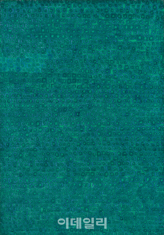 | | 김환기의 ‘무제’(1969∼1973). 잘 쓰지 않던 청록색으로 점점을 박아 완성한 전면점화로 색조면에선 단연 희귀작이다. 19일 ‘서울옥션 제145회 미술품경매’에서 추정가 16억∼25억원을 달고 새 주인을 찾는다(사진=서울옥션). |
