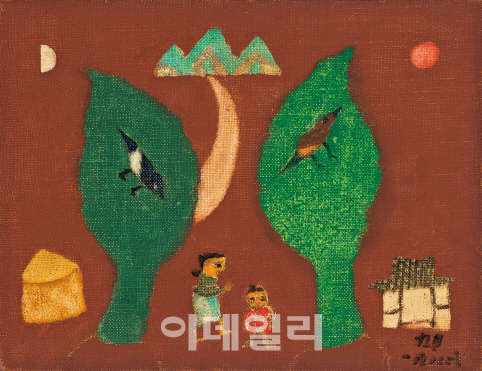 | | 장욱진 ‘풍경’(1986). 어머니와 아들 곁으로 까치·나무·달·해·집 등 장욱진이 좋아하는 소재가 다 담겼다. 19일 ‘서울옥션 제145회 미술품경매’에서 추정가 1억 3000만∼1억 8000만원에 주인 찾기에 나선다(사진=서울옥션). |