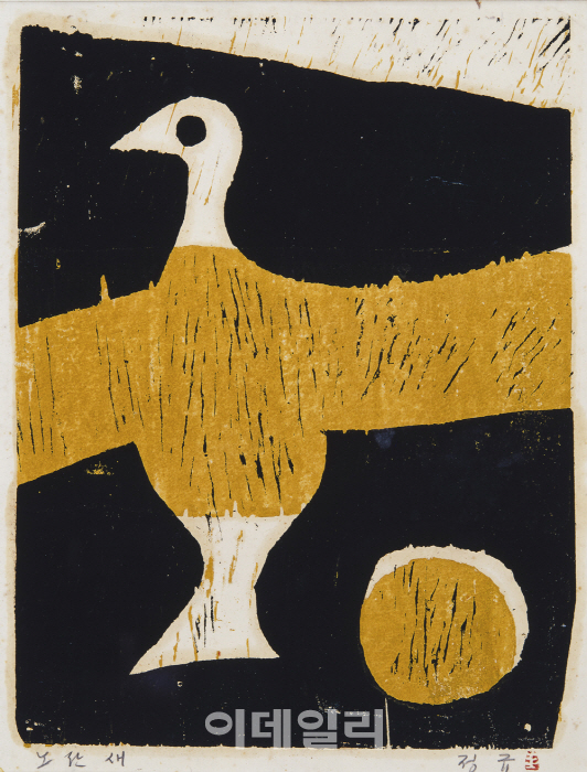 | | 한국현대판화의 1세대인 정규의 목판화 ‘새’(연도미상). 한국판화가 태동한 1950~1970년대를 대표하는 작품이다. 거친 칼질을 고스란히 드러낸 목각에 단순한 구도와 색을 입혀 강건한 맛을 풍긴다(사진=국립현대미술관). |