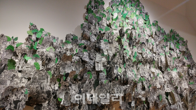 | | 김동기의 ‘바위섬’(2013·2017). 실크스크린으로 작업한 판화를 잘게 오려 거대한 설치작품으로 재탄생시켰다(사진=오현주 선임기자). |