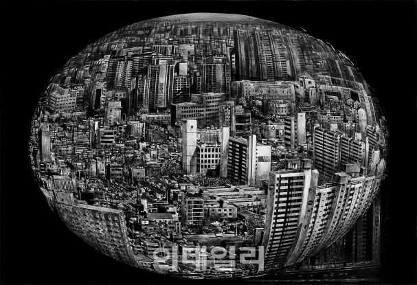 | | 윤세희의 ‘물방울의 정렬’(2006). 드라이포인트로 세밀하게 구현한 도시풍경. 송곳으로 60×60㎝ 크기의 동판 홈파기만 6개월이다(사진=국립현대미술관). |