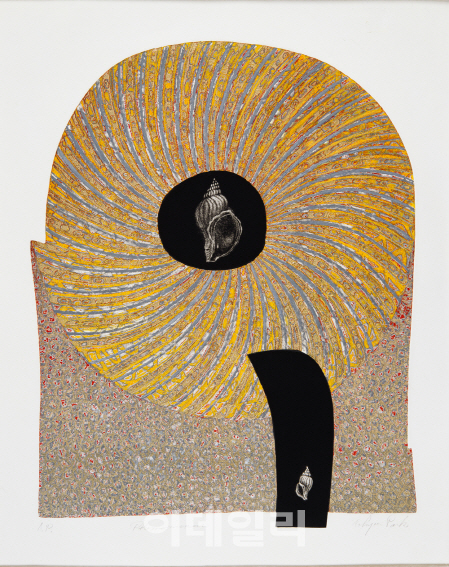 정규의 노랗고 검은 판은 박래현에 와서 다시 한번 그 색을 잇는다. 동판화의 한 종류인 메조틴트 방식으로 작업한 ‘작품’(1972)이다. 소라를 중심에 박은 부채를 형상화한 작품은 조각도가 낸 상처 대신 말끔한 엠보싱으로 입체감을 줬다. 판화가 아니라고 우겨도 통할 만큼 정교한 기법을 뽑낸다. 박래현이 의도한 회전성만을 본다면 한묵의 ‘검은 회전’(1973)이 그 뒤를 따른다. 에칭(동판화의 한 종류)으로 찍어낸 작품은 잘 다듬어낸 추상화 한 점을 보는 듯하다. 레이어라 부르는 ‘층위의 겹침’이 당시 벌써 만들어진 거다.