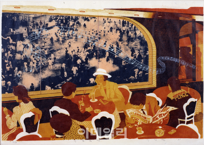 | | 이인철의 ‘신촌 풍경’(1991). 1990년대 초반 대학가 한 카페의 창이 갈라놓은 이중적인 사회상을 목판화와 실크스크린을 접목한 기법으로 교묘하게 드러냈다. 판화의 매체실험이 시작되는 시기의 작품이다(사진=국립현대미술관). |