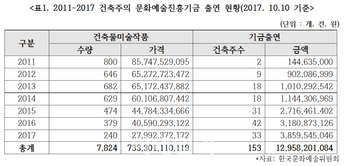 유 의원이 공개한 자료에 따르면 지난 7년간 건축주가 출연한 문예기금에 출연한 금액은 130억원에 달하는 것으로 나타났다. 2011년 1억4000만원에 불과했던 출연액은 지난해 31억원을 넘어 올해 39억원으로까지 급증했다. 문예기금에 출연한 건축주 수도 2011년 2명에서 올해 33명으로 늘었다.