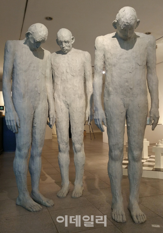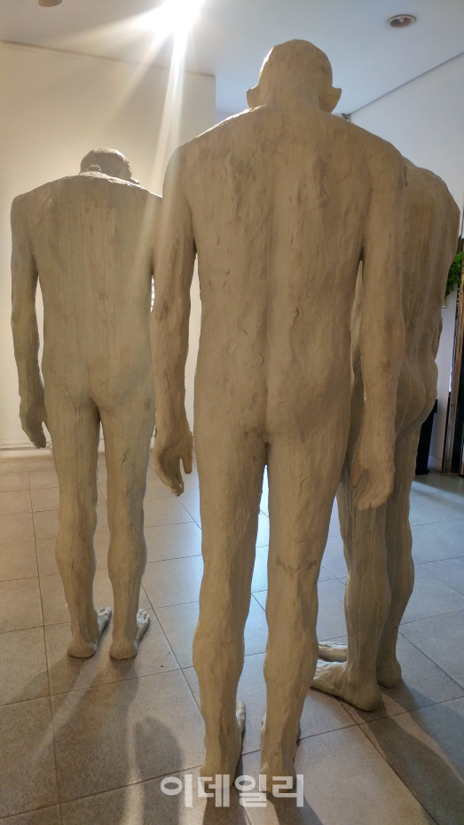 | | 배형경의 ‘존재, 물음’(2016) 뒷 모습. ‘나는 누구고 우리는 어디서 왔나’를 읊조리는, 세로 190㎝의 고뇌하는 거대한 인간상은 여성작가로는 드물게 30년 넘게 인체만으로 표현주의 구상조각을 고집해온 배 작가의 손끝에서 나왔다(사진=오현주 문화전문기자). |