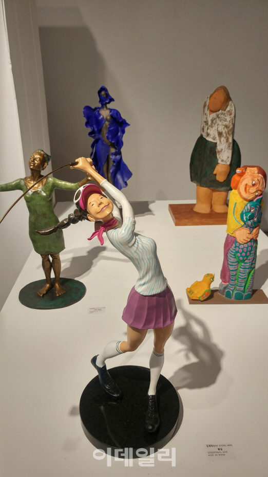 이뿐인가. ‘볼 때마다 기분 좋은 작품’이란 극찬을 받으며 ‘없어서 못 판다는 작가’ 김경민이 여성골퍼의 싱그러운 포즈를 잡아낸 ‘봄날’(2018·브론즈), 이만큼이나 상큼한 여성의 흉상을 반구상으로 작업한 이은희의 ‘아침햇살’(2014·대리석), 다소 어눌해 보이는 그래서 편안한 여인상을 빚은 정소영의 ‘행복한 나날’(2016·테라코타), 하이힐과 여성의 발을 교묘히 결합한 발상이 눈에 띄는 김지원의 ‘모던 걸’(2013·브론즈) 등등. 시선 뺏길 작품은 끝이 없다.