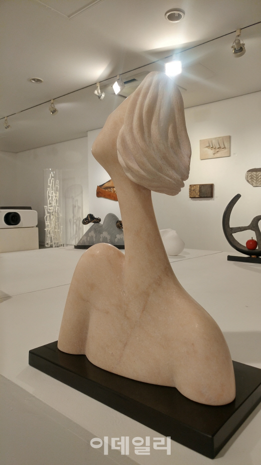| | 이은희의 ‘아침햇살’(2014·아래)은 대리석으로 작업한 여인의 흉상. 바람결에 휘날리는 머릿결의 여인에게선 육중한 돌무게따윈 느낄 수 없다(사진=오현주 문화전문기자). |