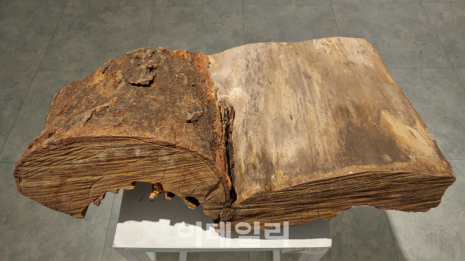 | | 강은엽의 ‘긴 여행에 관한 책’(2004). 함부로 손조차 함부로 댈 수 없을 듯한 고목의 결을 좇아 사람 사는 일의 희로애락을 가로 60㎝ 남짓한 나무덩이에 감춰놨다(사진=오현주 문화전문기자). |