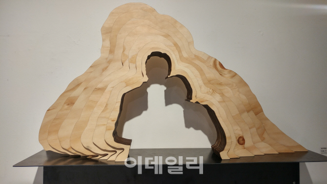 | | 최미애의 ‘창 안에 가족-연인’(2018). 나무를 크기대로 겹겹이 자르고 붙여 다정한 연인의 형상을 ‘빚어냈다’. 벽으로 투영한 조명 빛은 덤이다(사진=오현주 문화전문기자). |