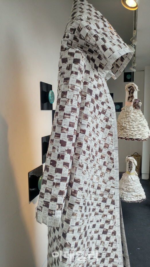 | | 정혜경의 ‘1400만원 유니폼’(2018·앞). 일일이 손으로 한 장씩 영수증을 겹쳐 짜 만들었다. 1400만원어치다. 뒤로 ‘도시환영-완벽한 껍데기’(2018)가 보인다. 역시 영수증을 한 장씩 풀로 붙여 어린아이가 입을 만한 옷을 지어냈다(사진=오현주 문화전문기자). |