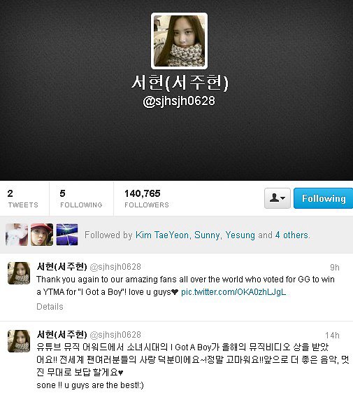 유튜브 뮤직비디오 상 수상 감격 나눠[이데일리 스타in 고규대 기자]서현이 트위터를 개설하자마자 10만 명의 팔로워를 확보했다.서현은 4일 오후 8시께 영어 이니셜과 생일을 조합한 아이디(@sjhsjh0628)로 트위터를 개설했다. 서현은 첫 트윗으로 “유튜브 뮤직 어워드에서 소녀시대의 ‘I Got A Boy’가 올해의 뮤직비디오상을 받았어요! 전 세계 팬여러분들의 사랑 덕분이에요~! 정말 고마워요! 앞으로 더 좋은 음악, 멋진 무대로 보답할게요”라는 글을 남겼다. 곧이어 영어로도 유튜브 수상을 감사하는 뜻을 전했다.