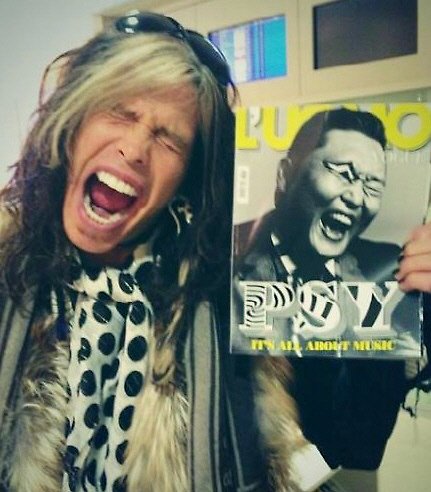 공개된 사진에는 스티븐 타일러가 매거진 ‘루오모 보그(L’UOMO VOGUE)‘ 10월호에 실린싸이의 표정을 따라하고 있다. 특히 싸이의 화통한 웃음을 흉내내기 위해 두 눈을 질끈 감고 입을 크게 벌리는 등 익살스러운 모습은 보는 이들을 폭소케 했다.