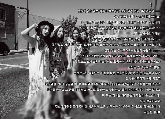 [이데일리 스타in 강민정 기자] 걸그룹 걸스데이(소진 유라 민아 혜리)가 데뷔 4주년을 맞아 팬들에게 감사인사를 전했다.9일 걸스데이는 공식 트위터를 통해 “지난 4년 동안 언제나 힘이 되어주고 함께 해주셔서 감사드려요~ 앞으로 오래도록 걸스데이로 활동하며 받은 사랑 다 돌려드릴께요~”라고 팬들을 향한 편지를 썼다.