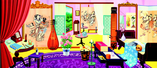 작품 ‘초대받은 N-김홍도 화방을 거닐다’는 김홍도의 작업실에 초대받아 간 것을 가정하고 그렸다. 남 작가는 이 작품 안에 비파와 생황, 거문고 등을 배치했다. 김홍도 관련 사료를 조사해보니 그가 음악을 즐겼다고 해서다. 김홍도가 생존 당시에는 있지도 않았던 커피주전자 등도 그려넣었다. 작업실에 찾아갔다면 김홍도가 후배 화가를 위해 커피 한 잔 내주지 않았을까를 상상해서다. 이처럼 시공을 초월한 소품을 그림 속에 다수 배치해 18세기의 김홍도와 21세기의 남 작가가 한 공간에 공존하는 것 같은 느낌을 준다.