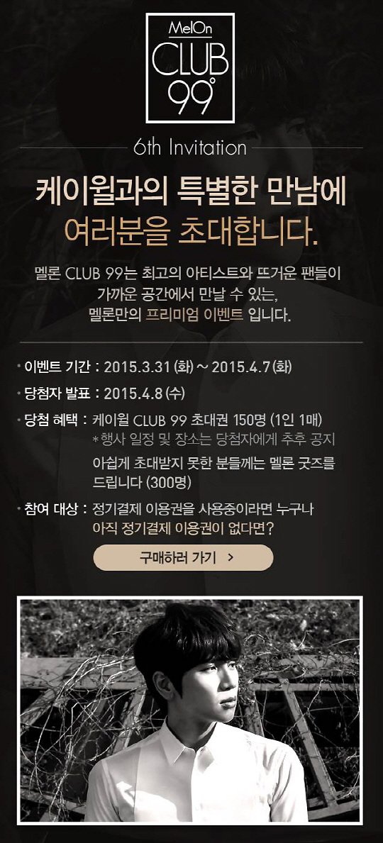[이데일리 스타in 김은구 기자] 음악 사이트 멜론(www.melon.com)이 6번째 미니앨범 ‘RE:’로 컴백해 인기몰이 중인 가수 케이윌과 직접 만날 수 있는 ‘클럽99°’ 이벤트에 멜론 고객을 초청한다.클럽99°는 정상급 아티스트와 뜨거운 팬들이 가까운 공간에서 만날 수 있는 멜론만의 ‘프리미엄 이벤트’이다. 오는 11일 열리는 케이윌의 클럽99°는 ‘케이윌과 함께 만드는 봄날의 추억’이라는 주제로 라이브 무대부터 퍼포먼스, 팬들의 궁금증을 풀어주고 앨범작업 비하인드 스토리를 들려주는 ‘회신(re)’토크까지 다양한 콘셉트로 진행된다. 팬들을 위한 스페셜 무대도 준비된다.