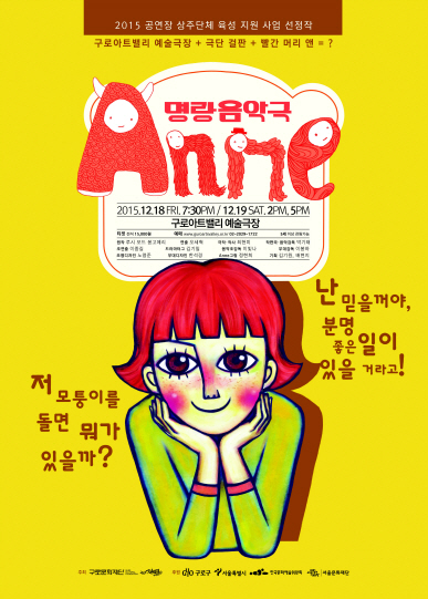 [이데일리 김미경 기자] 구로문화재단(이사장 이성)과 극단 걸판(대표 최현미)은 연말을 맞아 가족을 위한 명랑음악극 ‘앤’(Anne)을 18일부터 19일까지 이틀 동안 서울 구로구 구로아트밸리 예술극장 무대에 올린다고 14일 밝혔다.