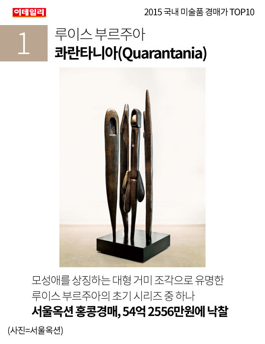 <☞관련기사 :2015 국내 미술품 경매시장 최고가 작품은?> 1. 루이스 부르주아 콰란타니아(Quarantania) 모성애를 상징하는 대형 거미 조각으로 유명한 루이스 부르주아의 초기 시리즈 중 하나. 서울옥션 홍콩경매, 54억 2556만원에 낙찰