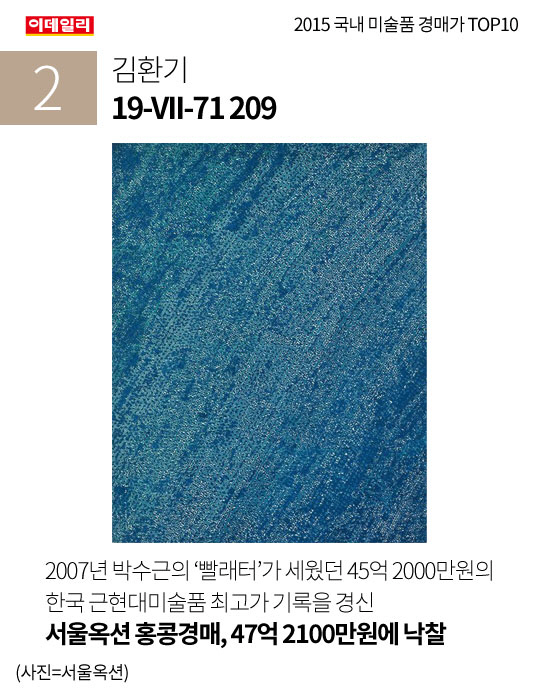 2. 김환기 19-VII-71 209 2007년 박수근의 ‘빨래터’가 세웠던 45억 2000만원의 한국 근현대미술품 최고가 기록을 경신. 서울옥션 홍콩경매, 47억 2100만원에 낙찰