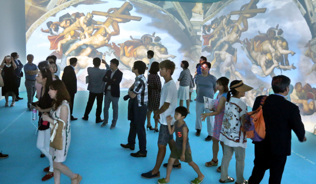 하지만 ‘미켈란젤로’ 전에서는 다르다. ‘천지창조’와 ‘최후의 심판’ 등 대형 회화작품을 컨버전스아트로 전시하는 덕에 인물 하나하나의 표정은 물론 근육의 미세한 움직임까지 놓치지 않고 볼 수 있다. 컨버전스아트는 원화를 디지털 이미지로 변환한 뒤 입체 영상신호로 프로그래밍해 고화질 프로젝터로 전시장 벽면의 대형스크린에 투사하는 방식을 취하는 전시기법이다. 실제 원화를 대형화면으로 확대해 볼 수 있고 애니메이션처럼 움직이는 효과를 넣을 수 있어 평면의 미술작품을 보다 쉽게 감상할 수 있는 최첨단기법으로 최근 각광받고 있다.