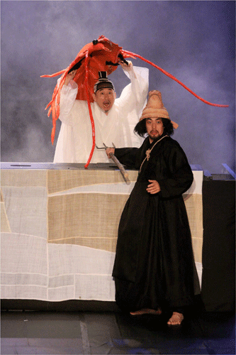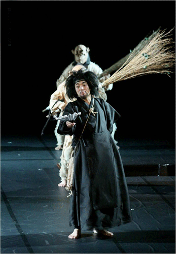 프로스페로의 신기한 마술을 우리네 관객 심성에 가찹게 다가들게 하기 위해서는 비과학적이고 비종교적이면서 현세의 바램을 처리해주는 주술을 공부하고 터득한 법사(도사가)로 환치하는 것이 바람직하여 프로스페로는 신라시대 「惠通」과 같은 법사로 등장합니다.