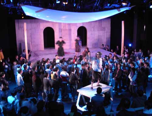 관객들은 배우를 올려다 봐야한다. 시장바닥처럼 때론 관객과 배우가 섞여 있기도 한다. 배우와 관객이 가장 가까운 곳에서 “시간과 공간”을 넘나드는 연극적인 경험을 하게 될 것이다.