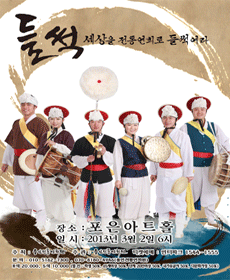 문(門)굿 “문엽쇼 문엽쇼 수문(守門)장군님 문엽쇼. 만인간(萬人間)이 들어가고 만고복록(萬古福祿)이 태산(泰山)같이 두리두둥실 많이 싣고 들어갑니다.” 원래 문굿은 풍물패들이 아무개의 집에 지신(地神)을 누르고 복을 빌어주러 들어 가기위해 외부세계와 그 집을 연결하는 문을 통과할 때 통과의례로서 치르는 절차를 말한다. 오늘 “공연장에서의 문굿”은 공연장과 외부를 연결하는 문을 통과할 때 공연장에 들어가기에 앞서 몸의 잡 부정들을 털어내고 공연이 잘 되기를 기원하면서 수문장군과 관객에게 공연의 시작을 알린다. 비나리 비나리는 비는 것이다. 비나이다..비나이다. 즉 기도인 셈이다. ‘비나리’라는 말은 남사당패가 걸립을 할 때에 하는 고사소리의 남사당패의 은어이다. 사물(四物)의 가락위에 축원(祝願)과 고사덕담(告祀德談)의 내용을 담은 노래를 얹어 부르는 것인데 제의성(祭儀性)이 매우강하다. 그래서 비나리는 공연의 맨 앞에 놓여지며 공연을 하는 사람과 공연장에 오신 모든 분들의 평안(平安)과 안녕(安寧)을 기원하는 것이다. 삼도설장고 풍물에서 설장고 연주는 최고의 연주자가 자신의 기량을 마음껏 발휘 할 수 있도록 고안 된것이며 춤과 놀이적인 요소가 중요한 요소이다. 삼도설장고는 경기·충청·호남·영남 지역의 최고의 장고잽이들이 연주하던 가락을 바탕으로 재구성하여 만들어졌다. 기본적으로 경기·충청 지역인 웃다리와 전라도지방의 호남우도,좌도 그리고 영남지방의 가락을 구성하여 통틀어“삼도”라는 명칭을 부여했으며 원래 풍물판에서 서서 연주하는 형태 의 “선반”을 앉아서하는 연주 “앉은반”의 연주형태로 연주된다. 가락의 엮음새는 기존의 「다스름-휘모리-동살풀이-굿거리-덩덕궁이」의 순서인데 삼도설장고는「다스름-굿거리-덩덕궁-동살풀이-휘모리」의 순서로 산조(散調)가 다스름 이후의 장단을 느린 것부터 빠른 것으로 늘어놓은것과 같은 형식을 가지고 있다. 첫째 목중 춤 첫째 목중은 쓰러져 얼굴을 두 소매로 가리고 누운 채로 타령장단에 맞추어 발끝부터 움직이는 동작을 시작한다. 겨우 전신이 움직이면 좌우로 삼전삼복(三轉三伏)하고 네 번 만에 간신히 일어서다 쓰러지나 끝내 일어서서는 두 팔로 얼굴을 가린 채 오른편을 살피고 왼편을 살핀다. 턱 앞에 모은 두 소매를 머리 위에서 만사위로 휘저으면서 전신을 결렬하게 부르르 떤다. 그리고 비로소 얼굴을 가린 소매를 떼고 붉은 가면을 처음 보인다. 재비의 타령장단이 한층 더 빨라지면 팔을 휘저으며 한쪽 다리를 쳐드는가 하면 한편 소매를 외사위로 휘저으면서 매우 쾌활한 깨끼춤을 추면서 탈판을 휘돈다. 합동춤 여덟 사람의 목중이 승려의 신분을 파계하여 음주가무를 즐기며 흥에 겨워 풍류소리에 맞추어 차례로 나와 춤 자랑을 한다. 마지막 여덟째 목중이 나와 먼저 춤을 추고나간 목중들을 불러내어 합동춤을 춘다. 합동춤은 봉산탈춤의 대표적인 춤이다. 여덞 명의 목중이 각자 개인 춤을 힘차고 역동적으로 한삼을 휘날리며 추는 춤으로 마치 춤의 경연대회처럼 장관을 이룬다. 각자 개인 춤을 끝내면 다 함께 불림을 하고 순서에 입각하여 진행되는데, 연풍대 모습은 하늘을 나는 듯하며 퇴장 시에는 까치걸음으로 경쾌하게 뛰어 연기처럼 사라진다. 안동 하회별신굿 탈놀이 [국가지정 중요무형문화재 제 69호] 하회별신굿탈놀이는 경상북도 안동시 풍천면 하회마을에서 12세기 중엽부터 상민(常民)들에 의해서 연희(演戱)되어온 탈놀이이다. 이 탈놀이는 마을의 안녕과 풍농을 기원하기 위하여 마을 굿의 일환으로 연희되었다. 별신굿이란 '별나다', ' 특별나다'는 의미를 지니고 있어 곧 별난 굿 또는 특별한 큰 굿을 의미한다. 이매 하회탈 제작에 얽혀있는 전설(傳說)의 내용처럼 미완성의 작품으로 턱이 없이 전한다. 얼굴의 형상은 코가 비틀어져 있으며, 눈은 실눈으로 눈 꼬리가 아래로 길게 처지고 이마와 볼의 주름살과 합쳐 좌.우 불상칭(不相稱-균형이 맞지 않음)한 조각의 선이 바보같이 웃는 표정을 나타낸다. 이것은 관상학적으로 사지 중 어느 한 부분이 틀어진 것으로 보며, 아래로 처진 눈 꼬리는 순박한 상으로 본다. 이매탈의 표정은 너무나 맑고 순박하며 걱정 하나 없는 듯 한 미소를 머금고 있다. 사자춤 여덞목중과 취발이, 노장스님 모두가 승려의 신분을 파계하고 세상사 즐거운 일에 전념하니 부처님이 노하여 이들에게 사자를 보내어 벌을 준다. 이에 모두 회개하여 잘못을 빌고 용서를 청한다. 사자는 이를 용서하고 화해의 춤을 춘다. 목중 하나가 마부가 되어 사자를 따라 나온다. 놀ㄹ아난 목중들을 벌하러 나온 목중들을 벌하러 나온 사자에게 용서를 빌고 사자와 함께 타령 장단과 굿거리장단에 맞춰 한참 춤을 추다가 퇴장한다. 삼도농악가락 삼도의 대표적인 풍물굿 가락을 모아 앉은반 의 형태로 연주하는 것으로 대부분의 사람들이 ‘사물놀이’라고하면 떠올리는 사물놀이 대표적인 모습이다. 삼도농악가락은 사물놀이의 초창기에는 말 그대로 ‘영남농악’ ‘웃다리풍물’ ‘호남우도굿’ 등 이름으로 따로 따로 나뉘어져 연