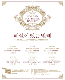 1997년 국립극장 소극장에서 처음 선보인 국립발레단의 <해설이 있는 발레>는 어렵게만 느껴졌던 발레에 해설을 더해 관객이 쉽고 즐겁게 볼 수 있도록 기획된 발레의 대중화에 앞장서온 대표적인 프로그램이다. 해를 거듭할수록 발레 사조, 안무가, 작곡가들의 이야기나 무대 뒷 이야기 등 다양한 내용으로 업그레이드해 왔다. 이번 시리즈는 공연장 문턱을 낮춘 전막 하이라이트 모음 뿐 아니라 전막 해설 프로그램을 통해 발레를 보다 더 깊이 있게 관람할 수 있는 기회가 될 것이다.