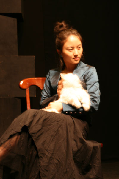 이번 연극의 포인트로는 무대가 세부분으로 나뉘어져있는데 가운데는 스크린 같은 느낌의 큰 흰 천을 가로질러 놓고 모든 사건이 그림자처럼, 주마등처럼 지나가는 사진이나 동영상 같은 느낌으로 이미지를 부각 시키도록 하는 것이다.