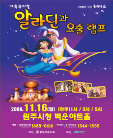 알라딘과 요술램프는 이솝우화에 버금가는 세계의 고전으로 "아라비안 나이트" 원작을토대로한 어린이 뮤지컬로서 알라딘이 램프를 올바르게 이용하는 소년이 되어가는 과정을 웅장하고 화려한 모험 이야기로 꾸며 극적 재미와 감동,교훈을 어린이들에게 선사하려 합니다. 이작품은 자기만 생각하는 개인주의에 물든 어린이들에게 친구의 소중함,우정,용기와 함께 "더불어 사는 것의 기쁨" 을 새삼 깨닫게 해줄수 있는 좋은 계기가 될 것입니다.